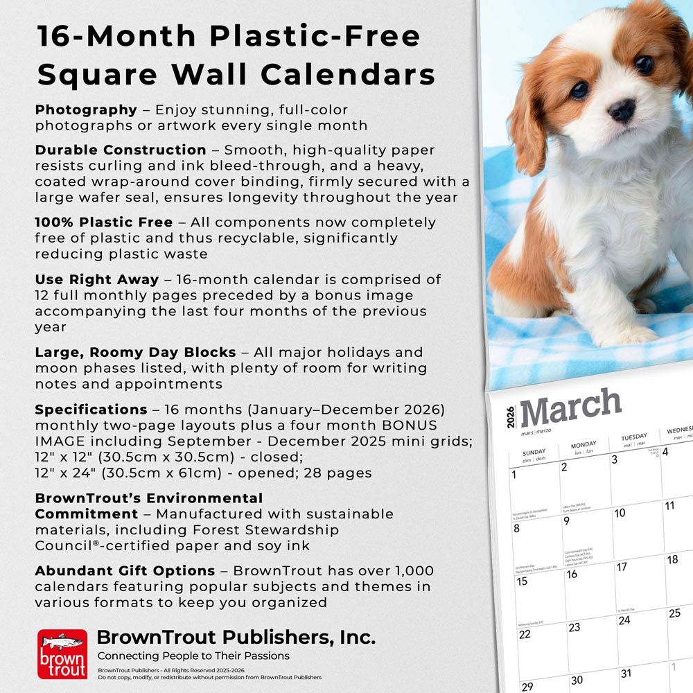 Genieße das ganze Jahr über den unwiderstehlichen Charme der Cavalier King Charles Spaniel Welpen mit dem Cavalier King Charles Spaniel Welpen Kalender 2026 von Browntrout. Dieser wunderschöne, auf Hochglanzpapier gedruckte Kalender beginnt im September 2025 und läuft bis zum Dezember 2026.