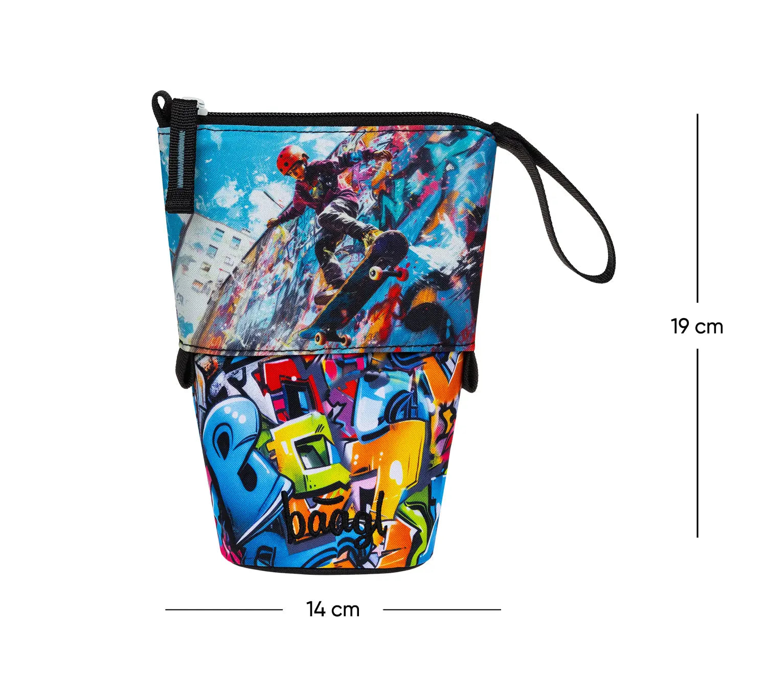 De Baagl Pop-up Etui Skatepark is een slim en veelzijdig etui met een cool skatepark design. Dankzij het innovatieve ontwerp verander je dit etui met één simpele beweging in een staande penhouder. Ideaal voor school, thuis of onderweg – perfect voor kinderen en skate-liefhebbers.