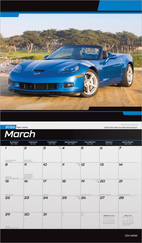 El Calendario Corvette 2026 Browntrout está hecho de papel satinado y comienza en julio de 2025 y tiene una gran foto del Corvette desde enero de 2026 hasta diciembre de 2026 debajo de las fechas disponibles del mes con espacio para notas personales y cumpleaños. Ya se han añadido al calendario algunas vacaciones (escolares) y días festivos importantes. El texto del calendario de 16 meses Corvette de Browntrout está impreso en inglés. Desplegado, el calendario mide aprox. 34 x 60 cm, con la imagen en la parte superior y las fechas del mes debajo.