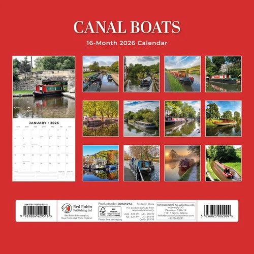 El Calendario de Barcos del Canal 2026 Red Robin está hecho de papel satinado y empieza en septiembre de 2025 y tiene una gran foto de los Barcos del Canal desde enero de 2026 hasta diciembre de 2026 debajo de las fechas disponibles del mes con espacio para notas personales y cumpleaños. Algunos días festivos importantes ya se han añadido al calendario. Los textos del calendario de 16 meses de Barcos del Canal de Red Robin están impresos en inglés. Desplegado, el calendario mide aprox. 30 x 60 cm, con la imagen en la parte superior y las fechas del mes debajo.