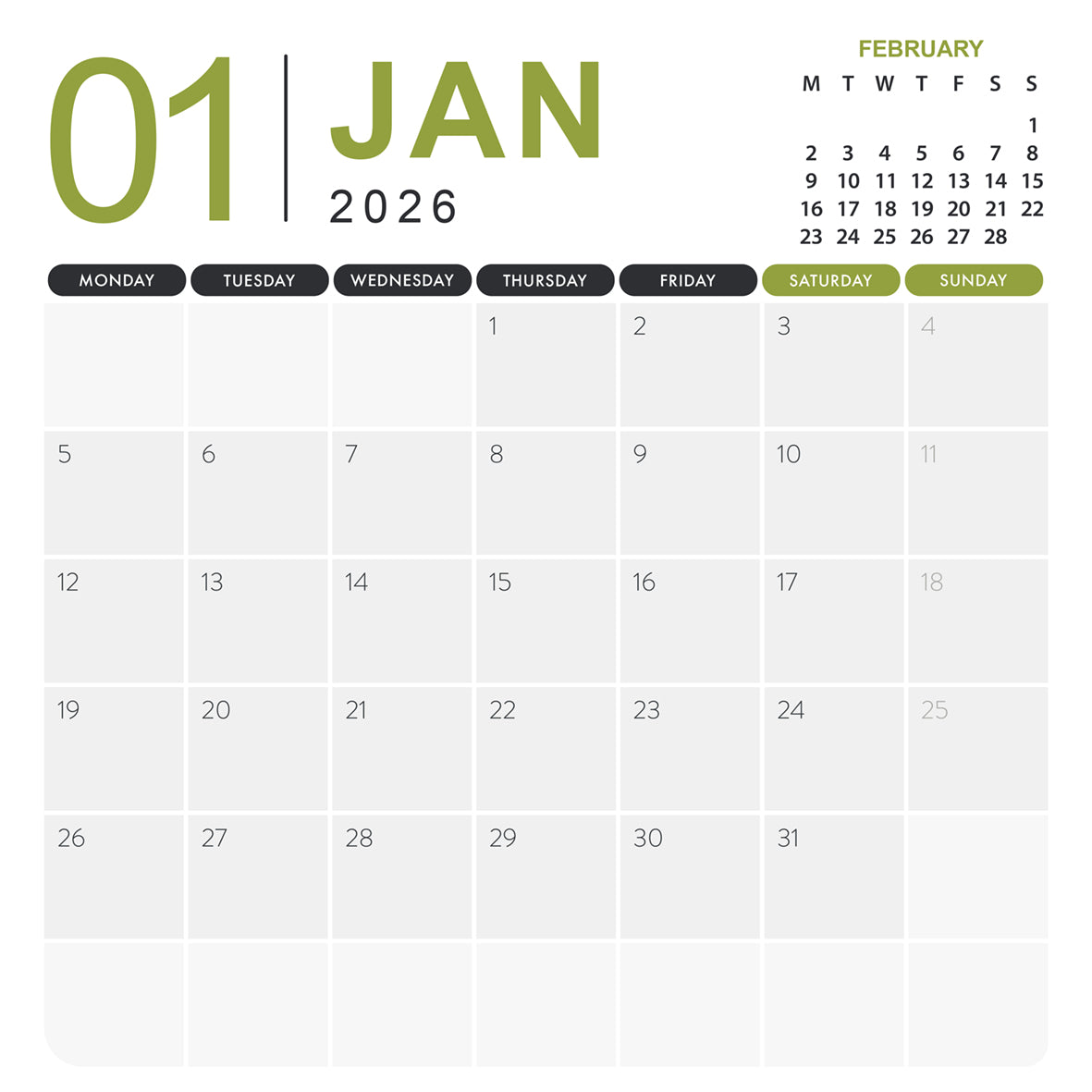 • 🇬🇧 Bovendien: Engelstalig kalendarium – met duidelijke maandnamen en weekstart op maandag
