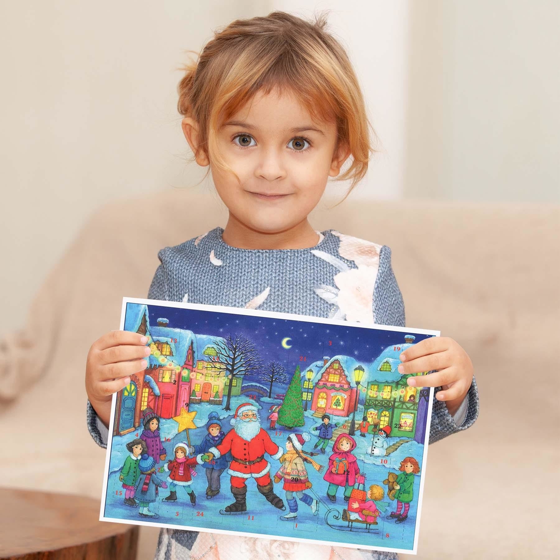 L'arrivée du Père Noël au village est de toute façon un grand événement. Mais le fait qu'il ait non seulement apporté de nombreux cadeaux, mais aussi ses patins, c'est encore mieux. Car c'est ainsi que notre calendrier de l'Avent au format A4 représente les enfants traversant l'étang gelé du village en patinant.
