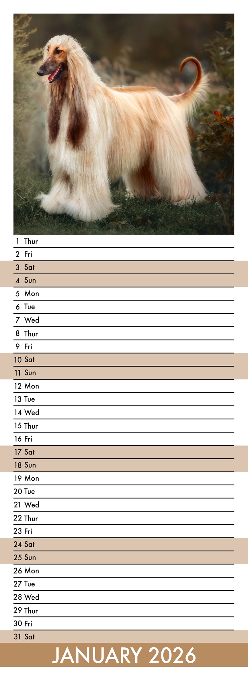 Ben jij onder de indruk van de gracieuze bouw, zijdeachtige vacht en trotse uitstraling van de Afghaanse Windhond? Dan is de Afghaanse Windhonden Slimline Kalender 2026 van CalendarsRus een elegante toevoeging aan jouw interieur. Met andere woorden: elke maand toont een schitterend portret van deze sierlijke windhond — in volle galop, rustend met fluwelen blik of vorstelijk poserend op een heuvel.