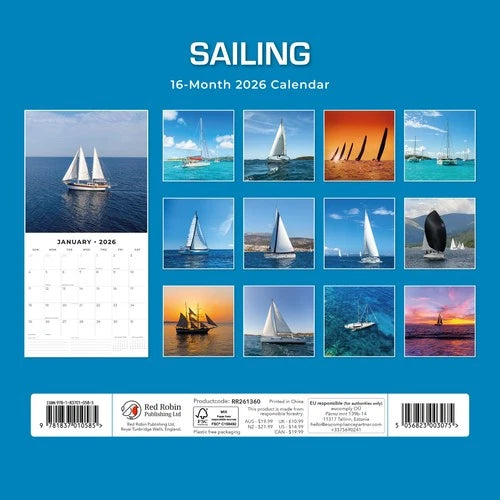 Calendrier mural plein de vent, d'eau et de liberté. Le calendrier de voile 2026 de Red Robin est un calendrier mural élégant et apaisant pour les passionnés de voile. S'étendant de septembre 2025 à décembre 2026, ce calendrier mural de voile unique montre mois après mois le pur sentiment de liberté que seule la voile peut donner.