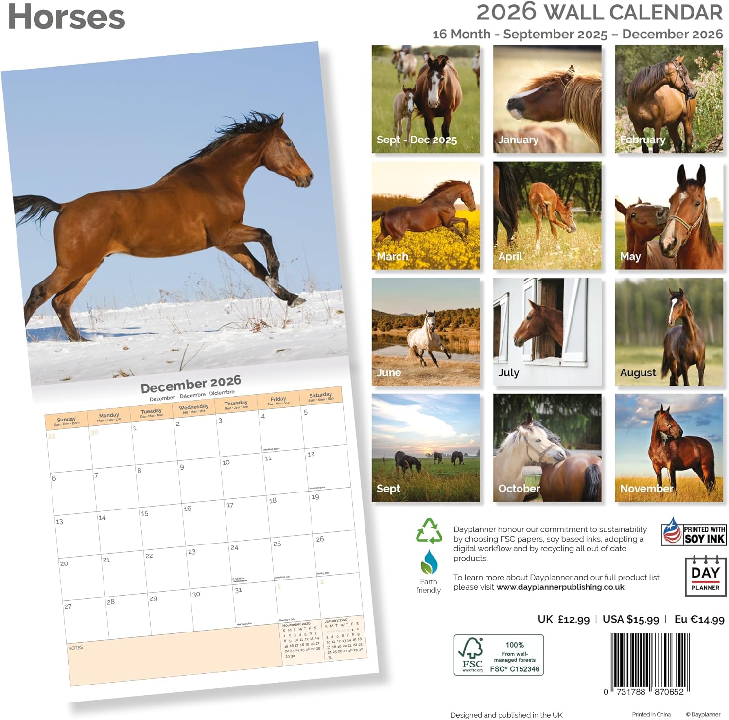 Le calendrier commence en septembre 2024 et comporte de janvier 2025 à décembre 2025 une grande image de Chevaux avec les dates disponibles du mois en dessous avec un espace pour les notes personnelles et les anniversaires. Un certain nombre de jours fériés importants ont été ajoutés à l'avance sur le calendrier. Les textes du calendrier Horses 16 mois sont imprimés en anglais. Déplié, le calendrier mesure environ 30 x 60 cm avec l'image en haut et les dates du mois en dessous. Le calendrier est doté d'un trou en haut pour être facilement accroché à un crochet ou à un clou. Par exemple, dans la cuisine, le bureau ou les toilettes.