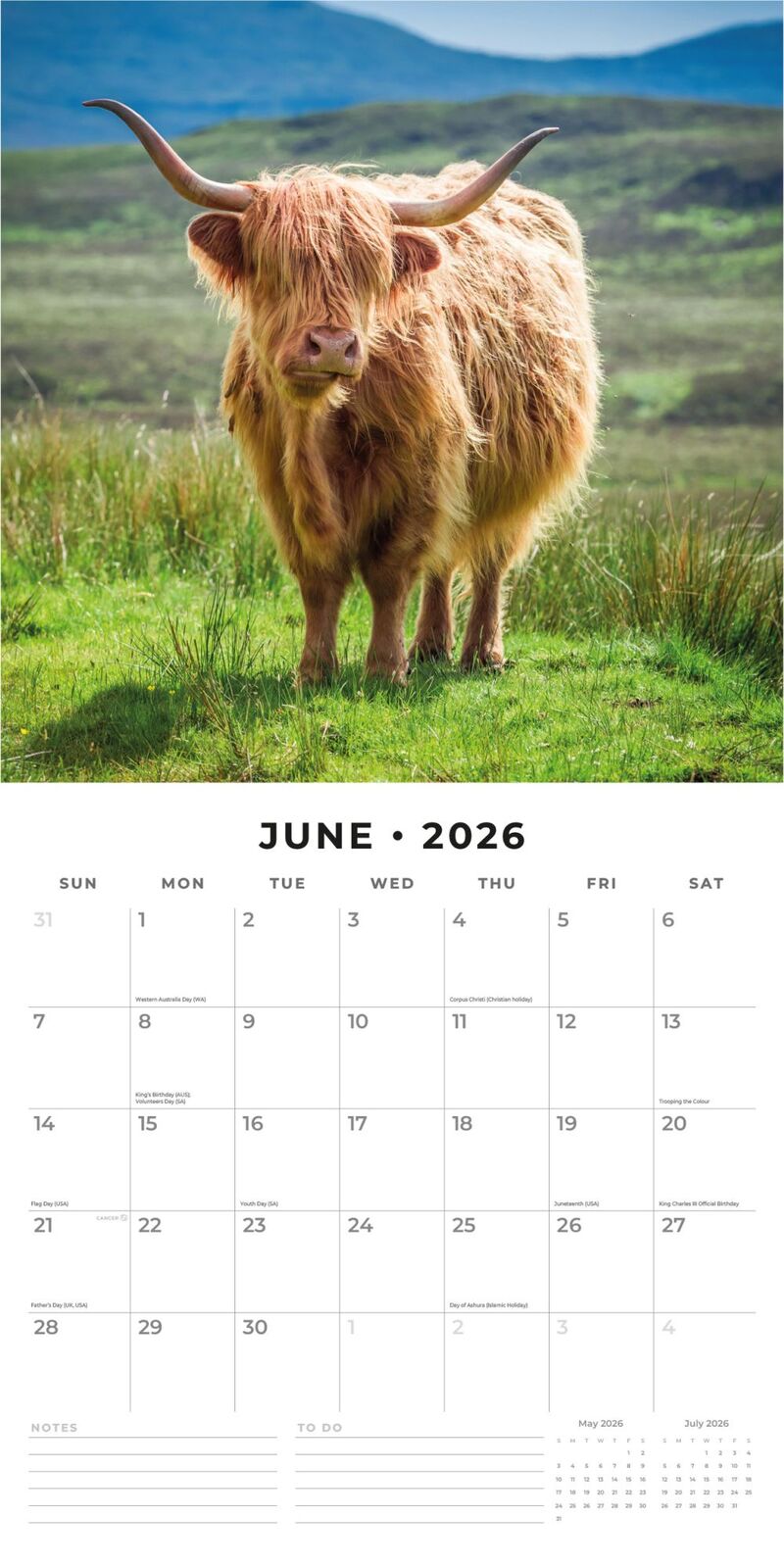Le calendrier Scottish Highlander 2026 Red Robin est fabriqué en papier glacé et commence en septembre 2025 et a une grande photo du Scottish Highlander de janvier 2026 à décembre 2026 en dessous avec les dates disponibles du mois avec un espace pour les notes personnelles et les anniversaires. Un certain nombre de fêtes importantes ont déjà été ajoutées au calendrier. Les textes figurant sur le calendrier Scottish Highlander 16 mois de Red Robin sont imprimés en anglais. Déplié, le calendrier mesure environ 30 x 60 cm avec l'image en haut et les dates du mois en dessous.