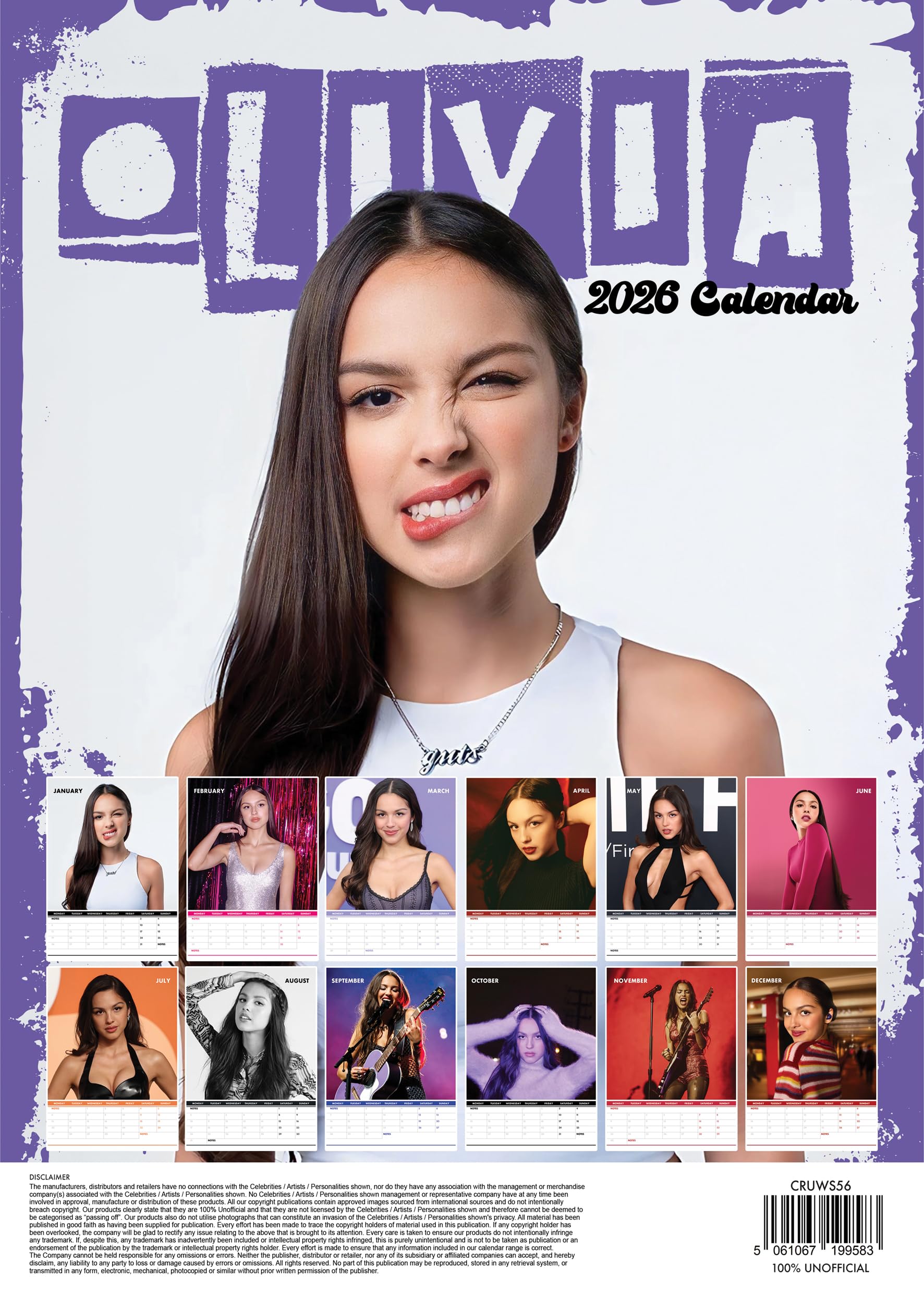 Le calendrier Olivia Rodrigo A3 pour 2026 contient un total de 12 images différentes en couleur, chaque mois une nouvelle photo magnifique de cette Célébrité. Un must absolu pour le véritable amoureux d'Olivia Rodrigo.