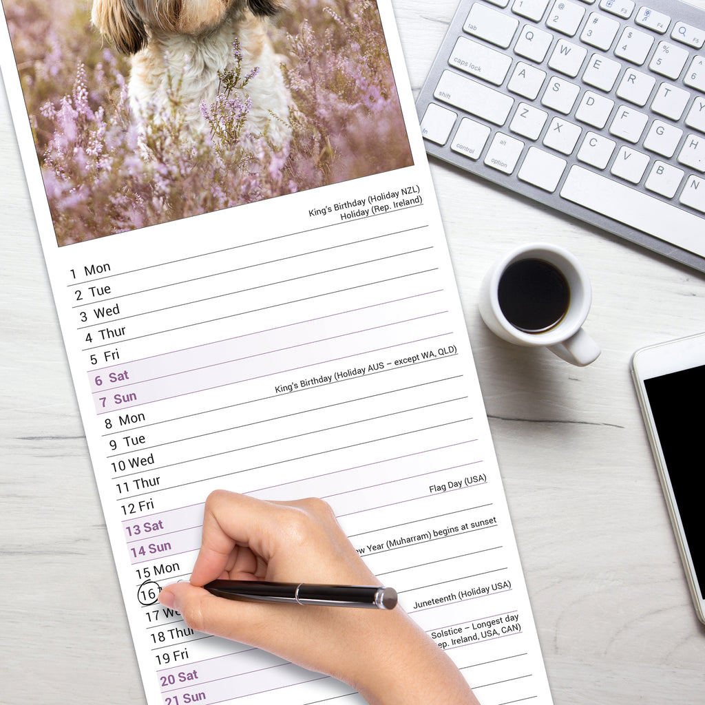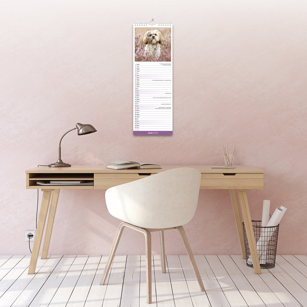 Le calendrier Shih Tzu Slimline 2026 Avonside est fabriqué en papier glacé et commence en janvier 2026 à décembre 2026 une grande photo du Shih Tzu en dessous les dates disponibles du mois avec de l'espace pour les notes personnelles et les anniversaires. Un certain nombre de vacances (scolaires) importantes et de jours fériés ont déjà été ajoutés au calendrier. Les textes du calendrier Shih Tzu 12 mois d'Avonside sont imprimés dans les 5 langues suivantes : anglais, français, allemand, italien et espagnol. Déplié, le calendrier mesure environ 15 x 42 cm avec l'image en haut et les dates du mois en dessous.