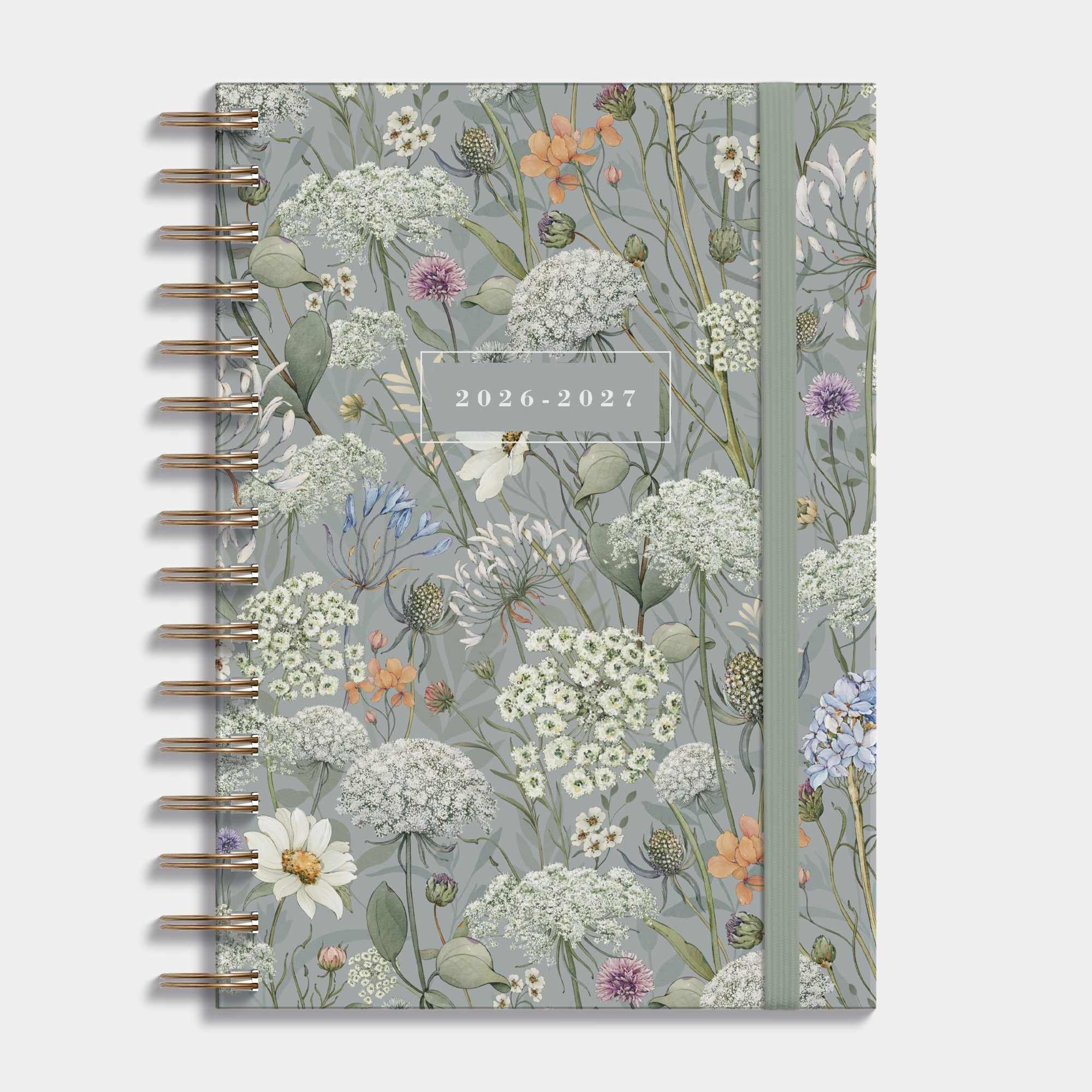 Op zoek naar een frisse en stijlvolle agenda 2026-2027? Deze agenda 2026-2027 heeft een prachtige cover met een print van weidebloemen op een groenige achtergrond. De koperkleurige ringband geeft de agenda een luxe en moderne uitstraling. Perfect voor gebruik op school, werk of thuis.