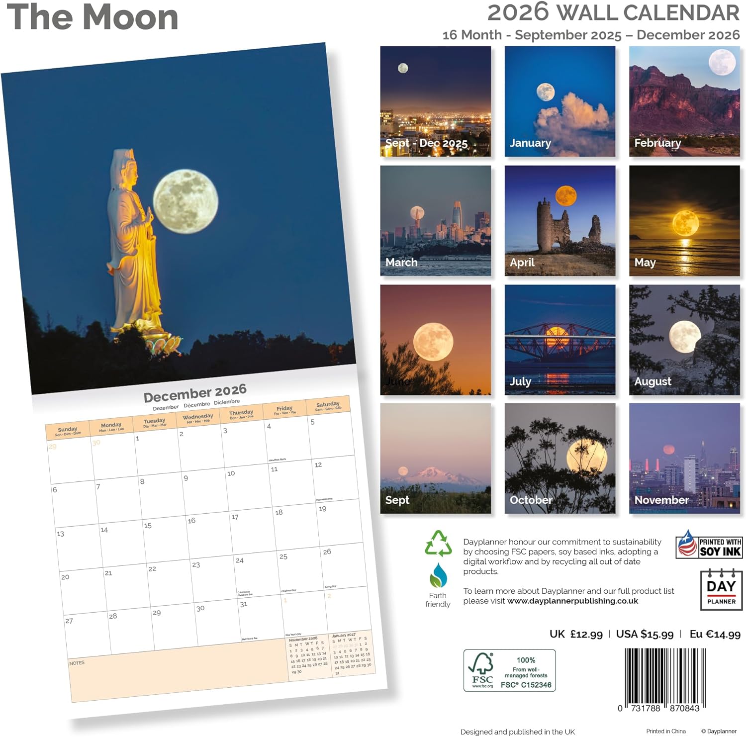 Il calendario inizia a settembre 2024 e presenta una grande immagine della Luna da gennaio 2025 a dicembre 2025 con le date disponibili del mese sottostante e uno spazio per note personali e compleanni. Alcune festività importanti sono state aggiunte in anticipo sul calendario. I testi del calendario Moon 16 mesi sono stampati in inglese. Piegato, il calendario misura circa 30 x 60 cm con l'immagine in alto e le date del mese in basso. Il calendario è dotato di un foro in alto per poterlo appendere facilmente a un gancio o a un chiodo. Ad esempio in cucina, in ufficio o in bagno