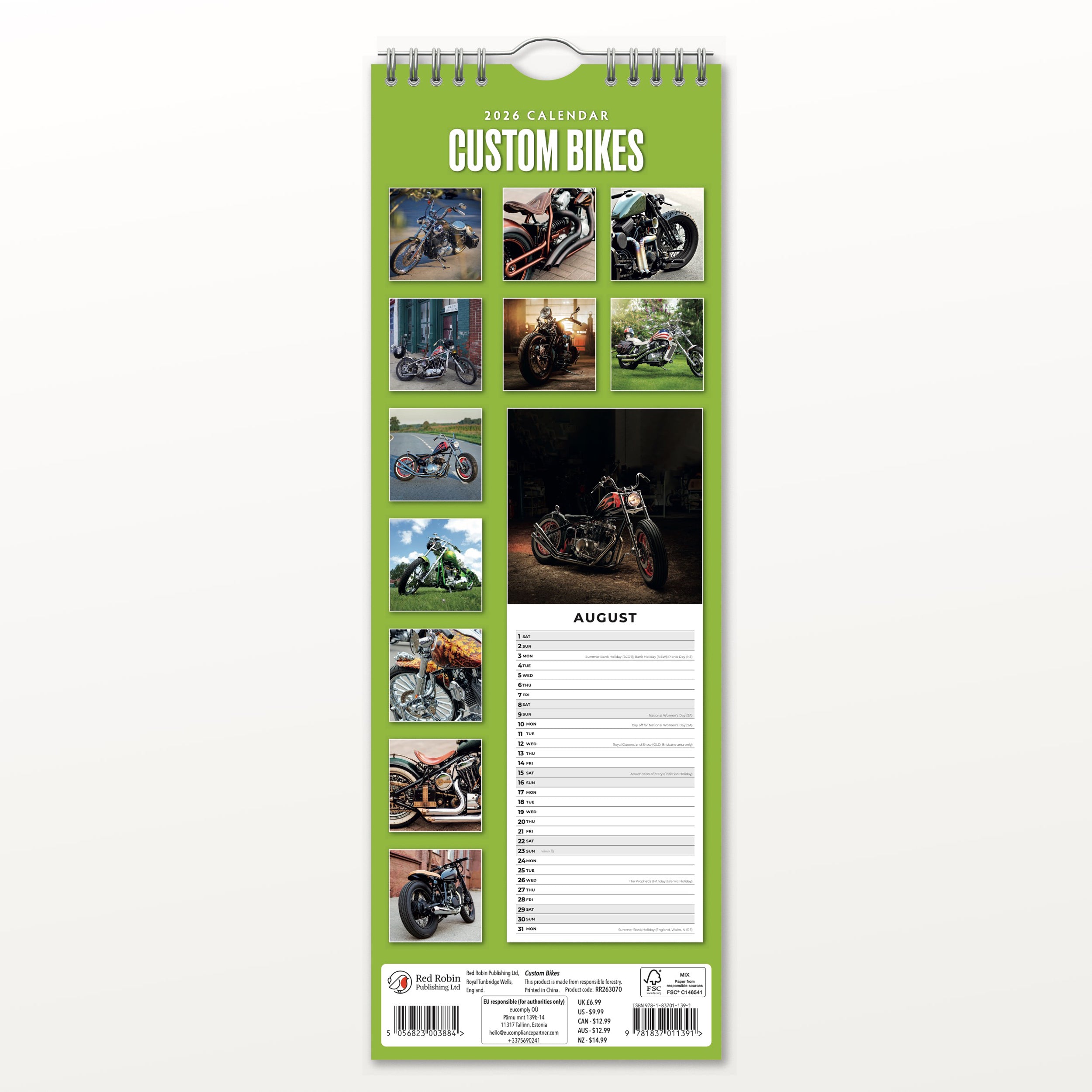 Are you crazy about custom bikes, shiny steel and pure style? Then the Custom Bikes Slimline Calendar 2026 by Red Robin is the calendar for you. In other words, each month sees a unique motorcycle - from sleekly tuned bobbers to roaring choppers and urban scramblers.