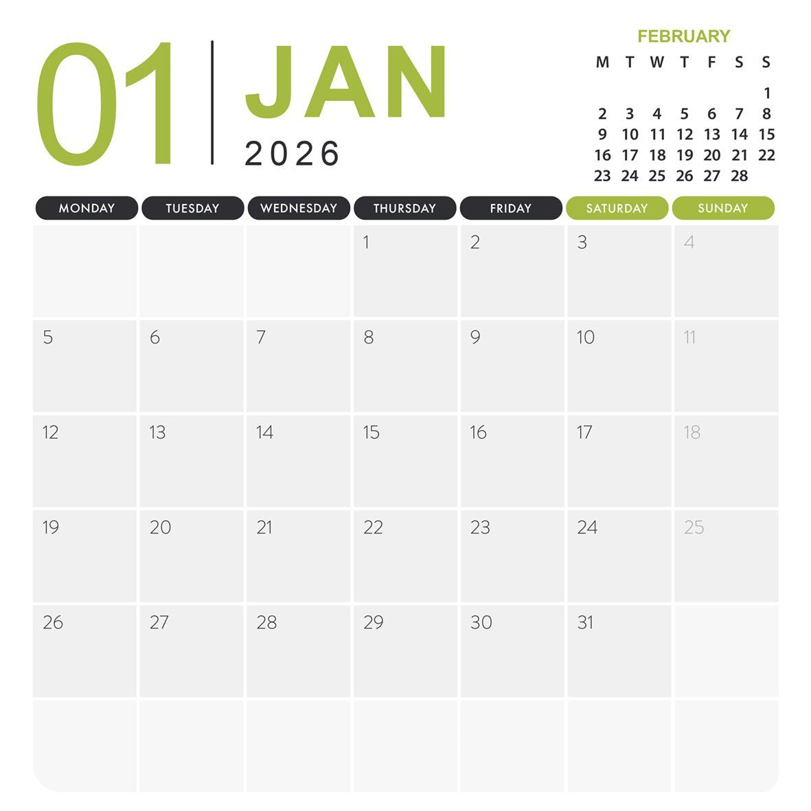 • 🇬🇧 Bovendien: volledig Engelstalig kalendarium – met weekindeling vanaf maandag