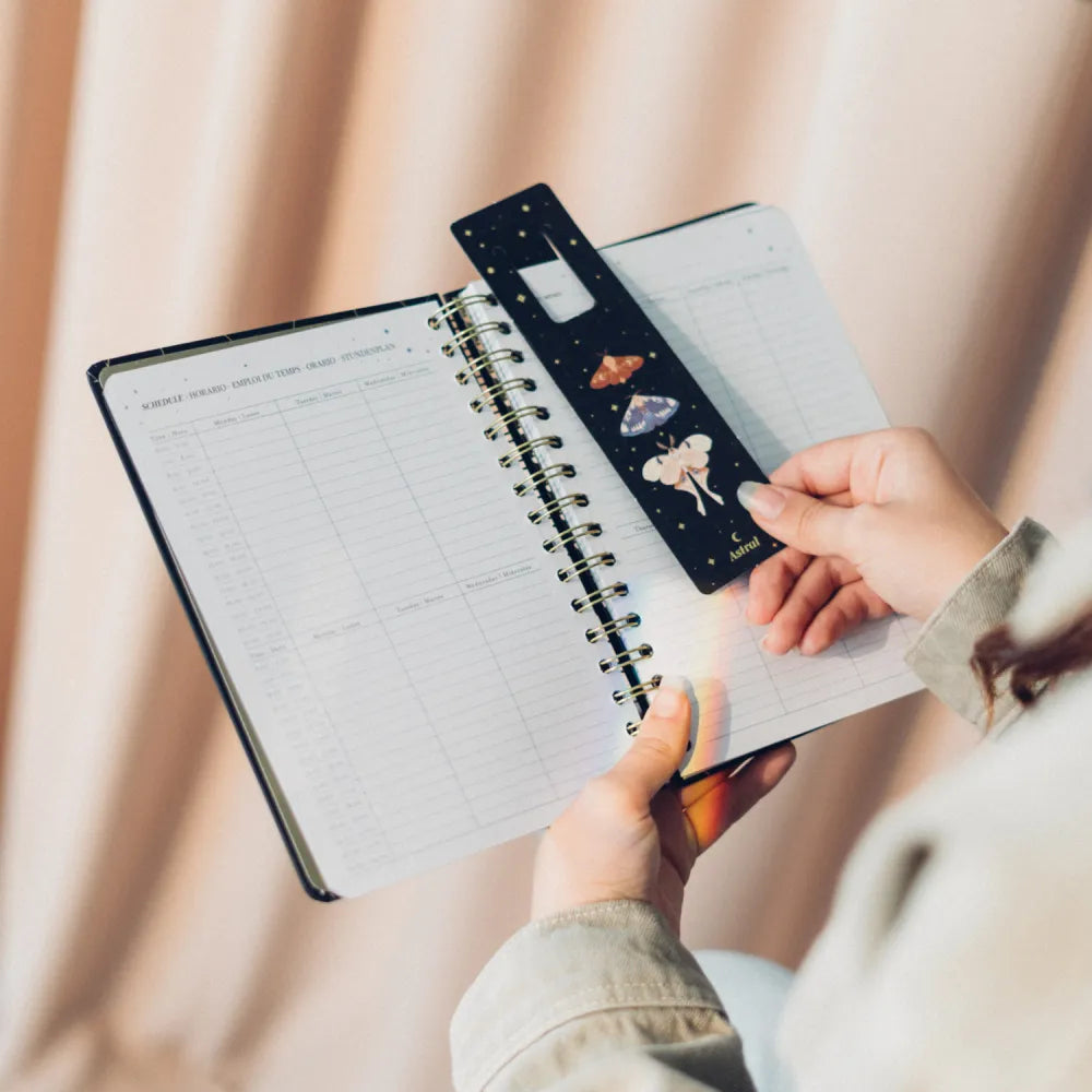 De Astral Agenda is een combinatie van praktische weekindeling en visuele verfijning. Bovendien: het gepersonaliseerde interieur, de stickervellen en de uitgestanste boekenleggers maken het plannen tot een ritueel met stijl.
