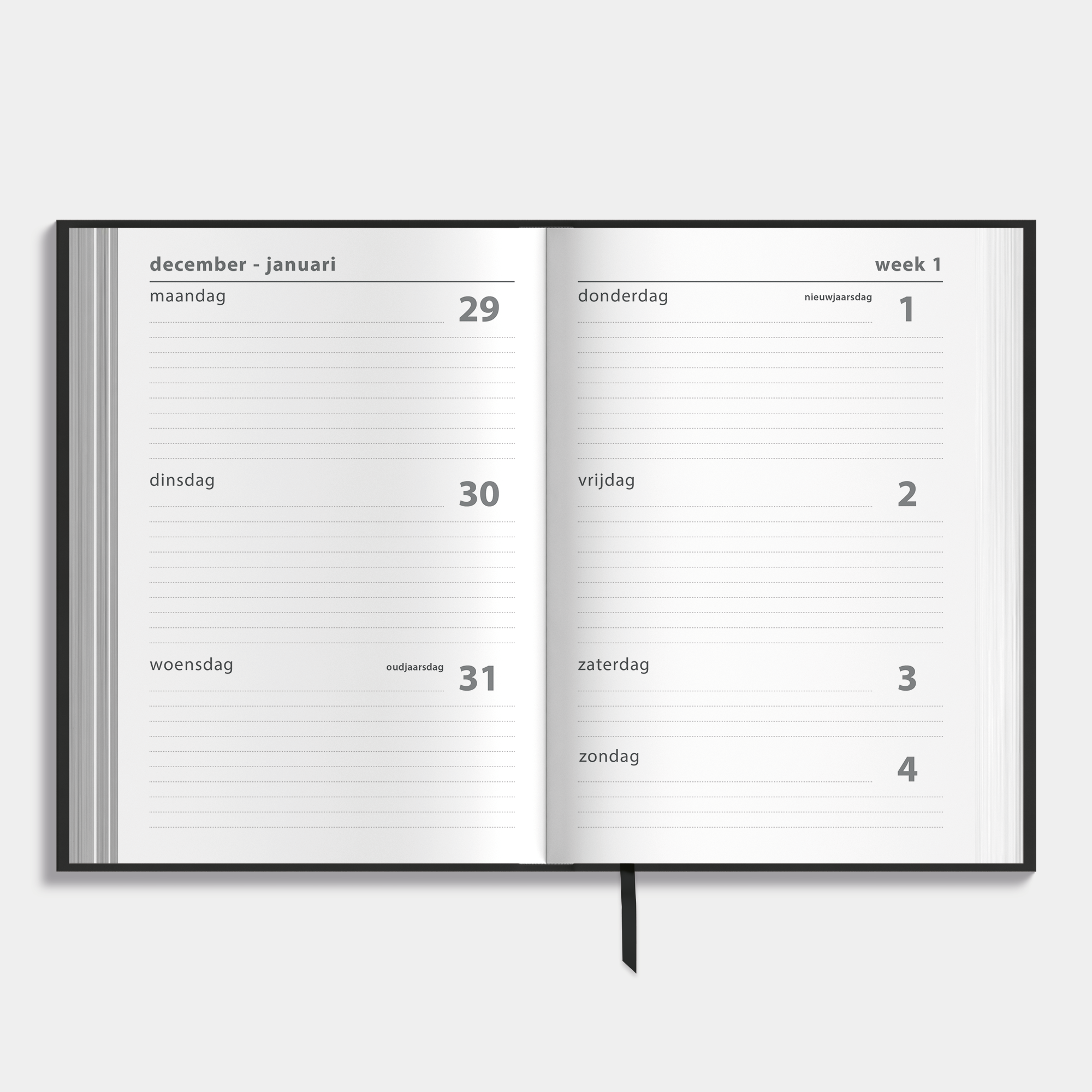 Een rustige en functionele planner met weekoverzicht, harde cover en subtiele zilverfoliedruk.