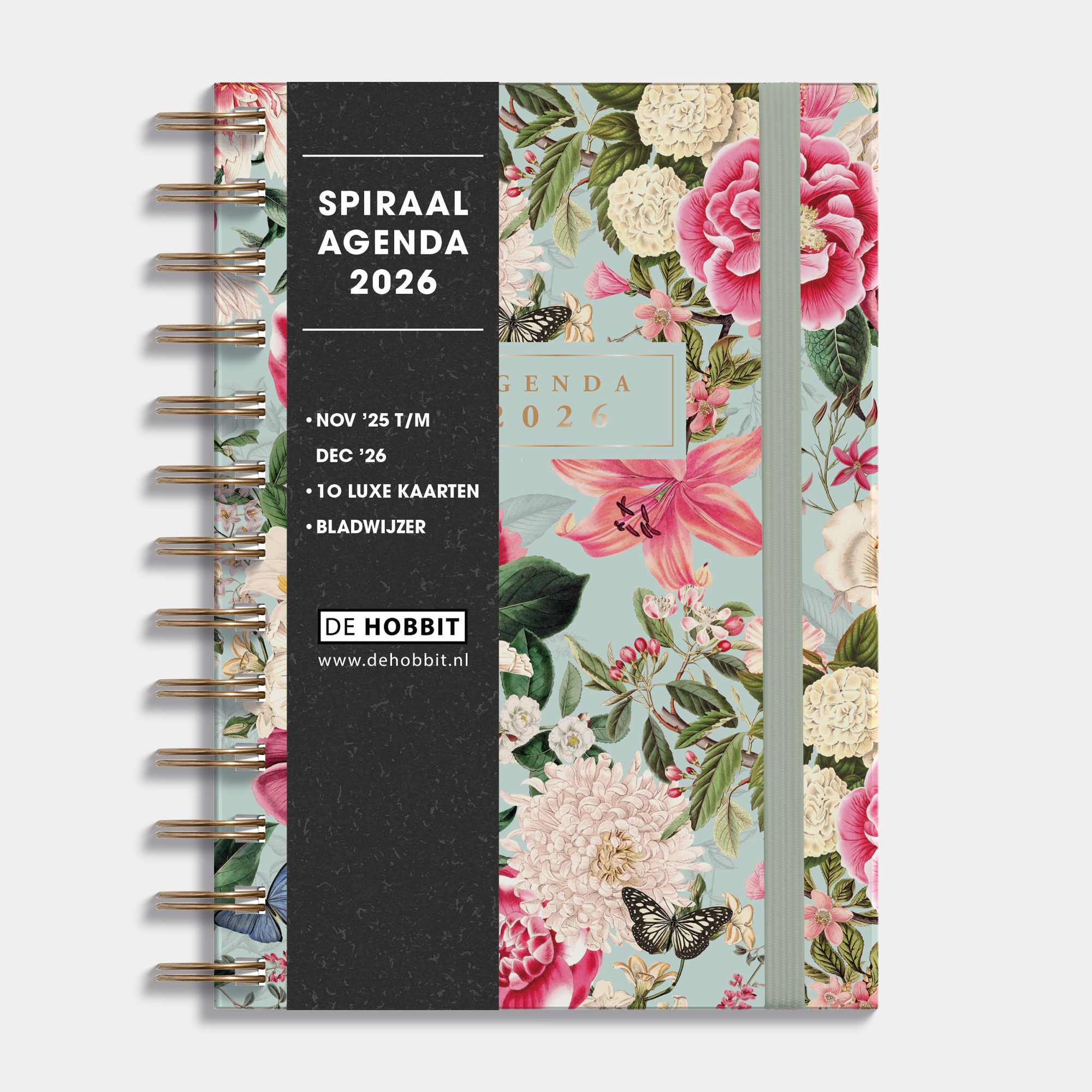 Voeg een vleugje vrolijkheid toe aan je planning met deze ringband agenda. De stevige harde cover is voorzien van een charmante print met vlinders en bloemen, terwijl de tekst op de omslag straalt in goudfolie. Dankzij de praktische elastieke band blijft je agenda netjes gesloten, en met de verplaatsbare bladwijzer vind je direct de juiste datum.