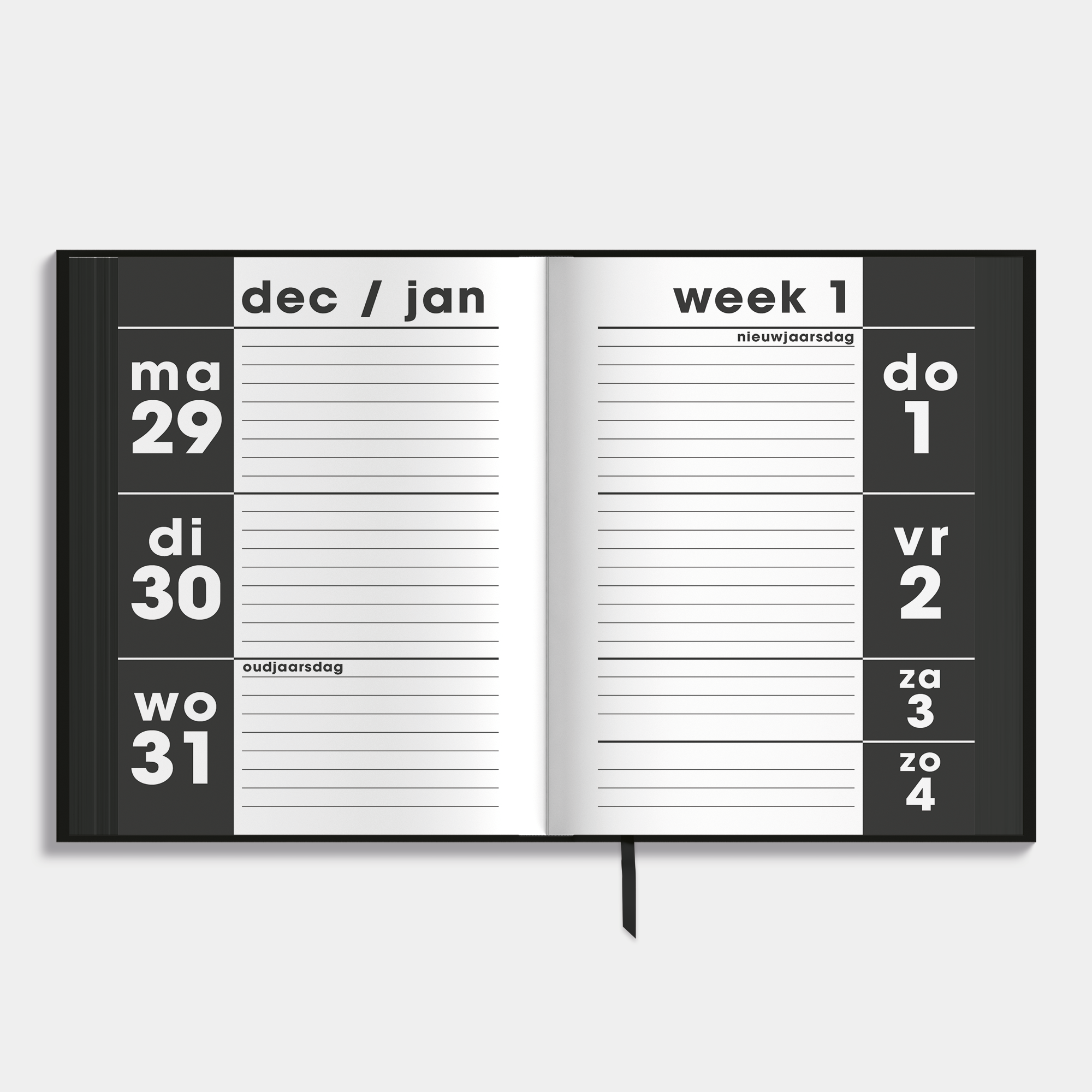 Een praktische agenda met grote letter, ideaal voor iedereen die wat moeite met het zicht heeft. Uitgevoerd in zwart/wit met een rustige, sobere vormgeving voor optimale leesbaarheid.