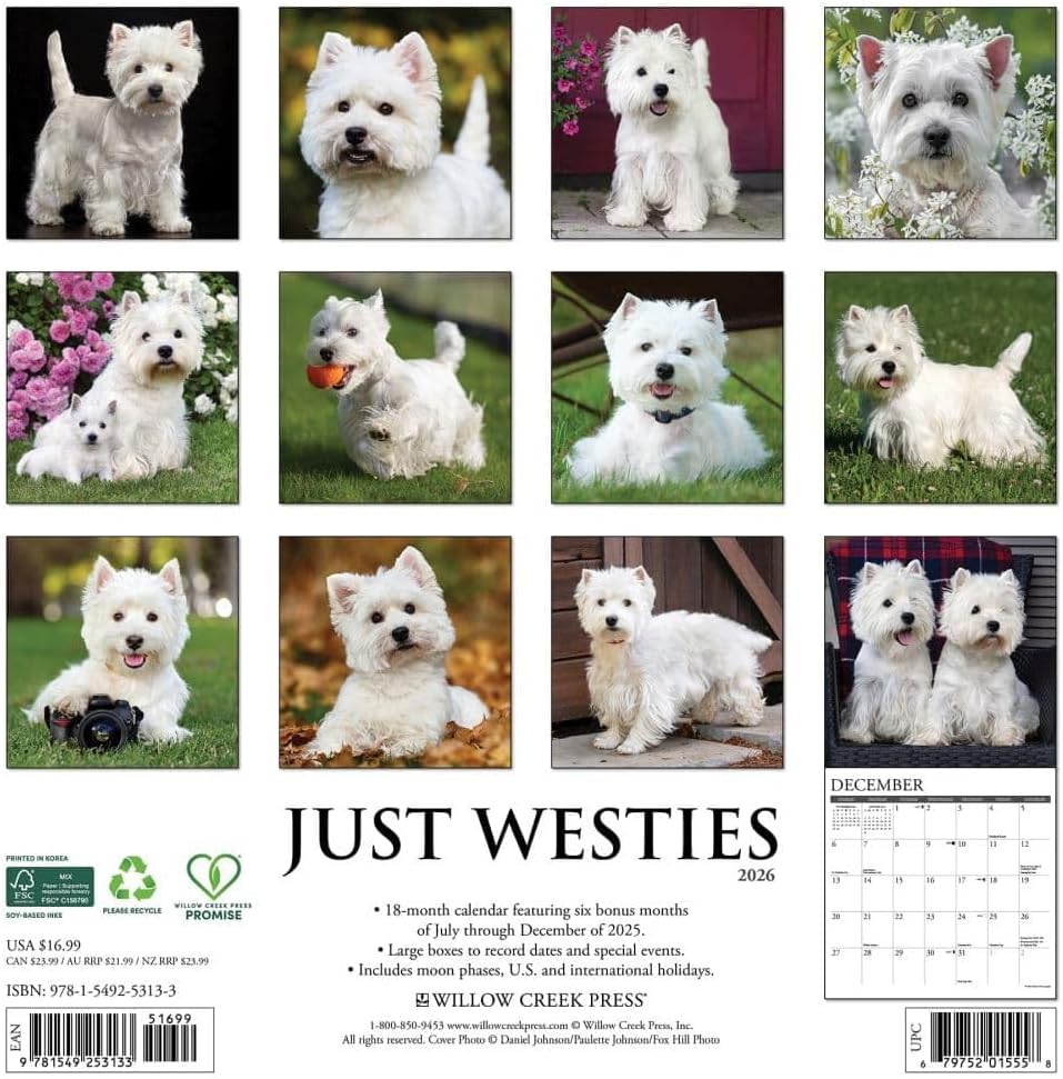 West Highland White Terrier maandkalender 2026 met prachtige foto's. Een jaar lang elke maand een prachtige West Highland White Terrier foto met voldoende ruimte voor al uw afspraken. Makkelijk op te hangen door het gaatje welke reeds is voor geperforeerd. Lees meer