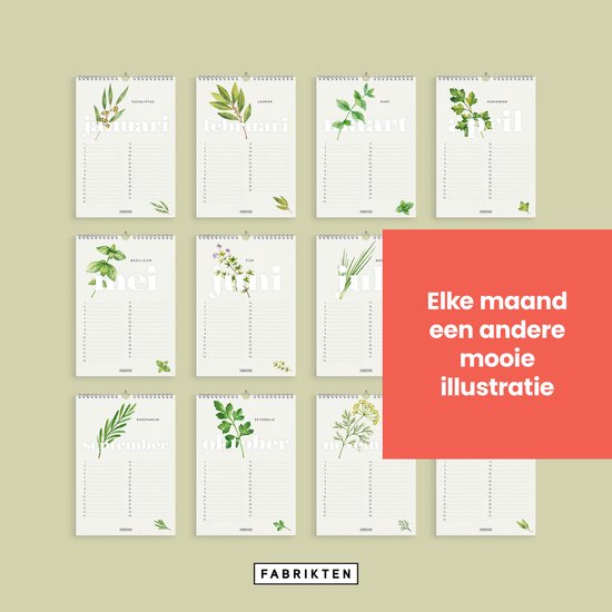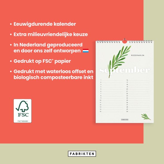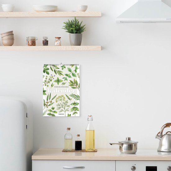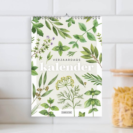 Deze verjaardagskalender is met zorg in Nederland ontworpen en geproduceerd op 300 grams duurzaam Biotop papier. De elegante groene en herbale illustraties, gecombineerd met een metaalkleurige spiraalbinding en een praktisch ophangoog, zorgen voor een rustige en stijlvolle uitstraling aan de muur.