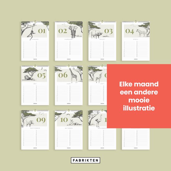 • Maandelijks een unieke illustratie van safari-dieren in warme, natuurlijke tinten