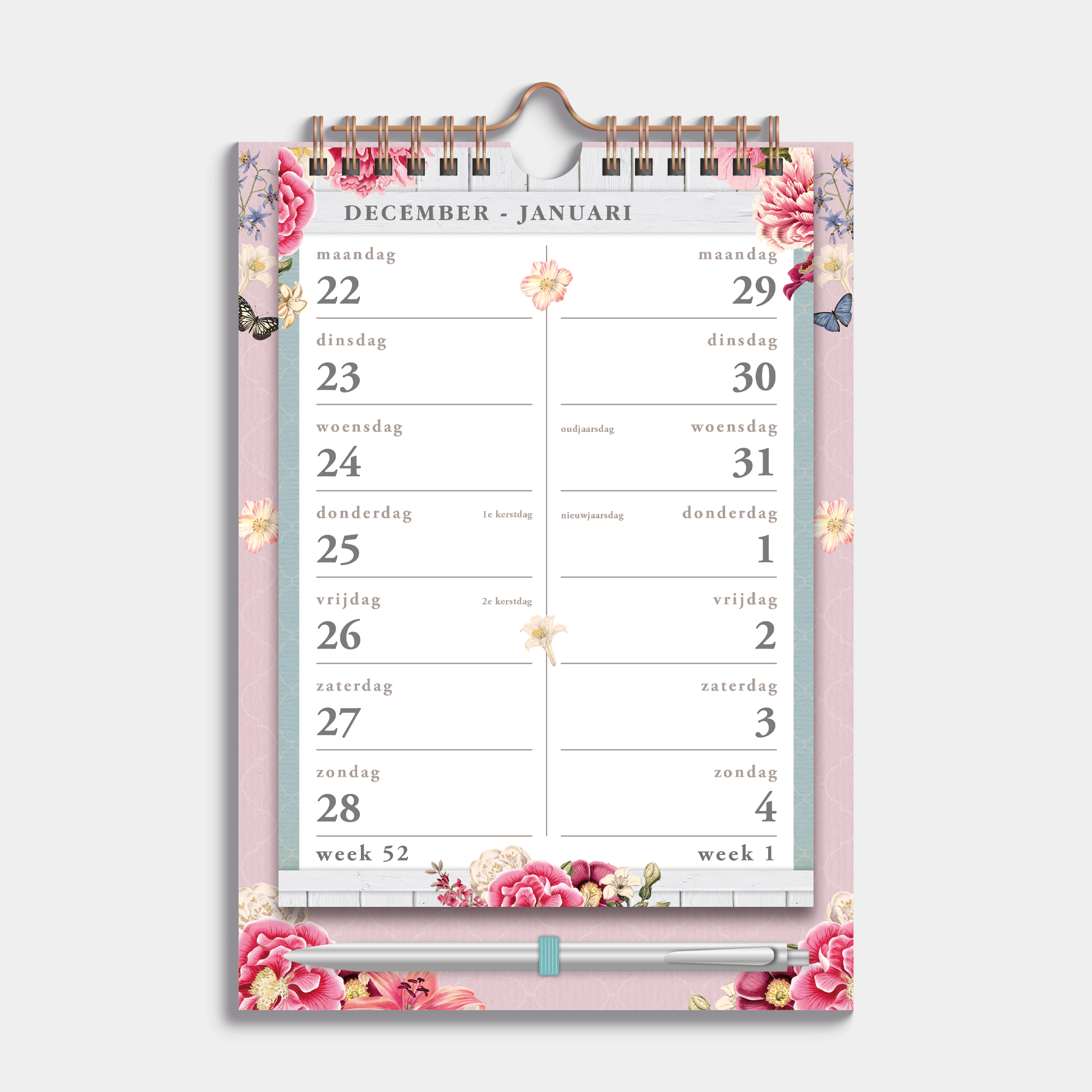 Fine A5 spiral calendar on board with pen. Two weeks on one sheet. Planning ahead is easy! Executed in our theme brocante, with copper spiral and ditto hanger. This spiral calendar runs from November 2025 to December 2026
