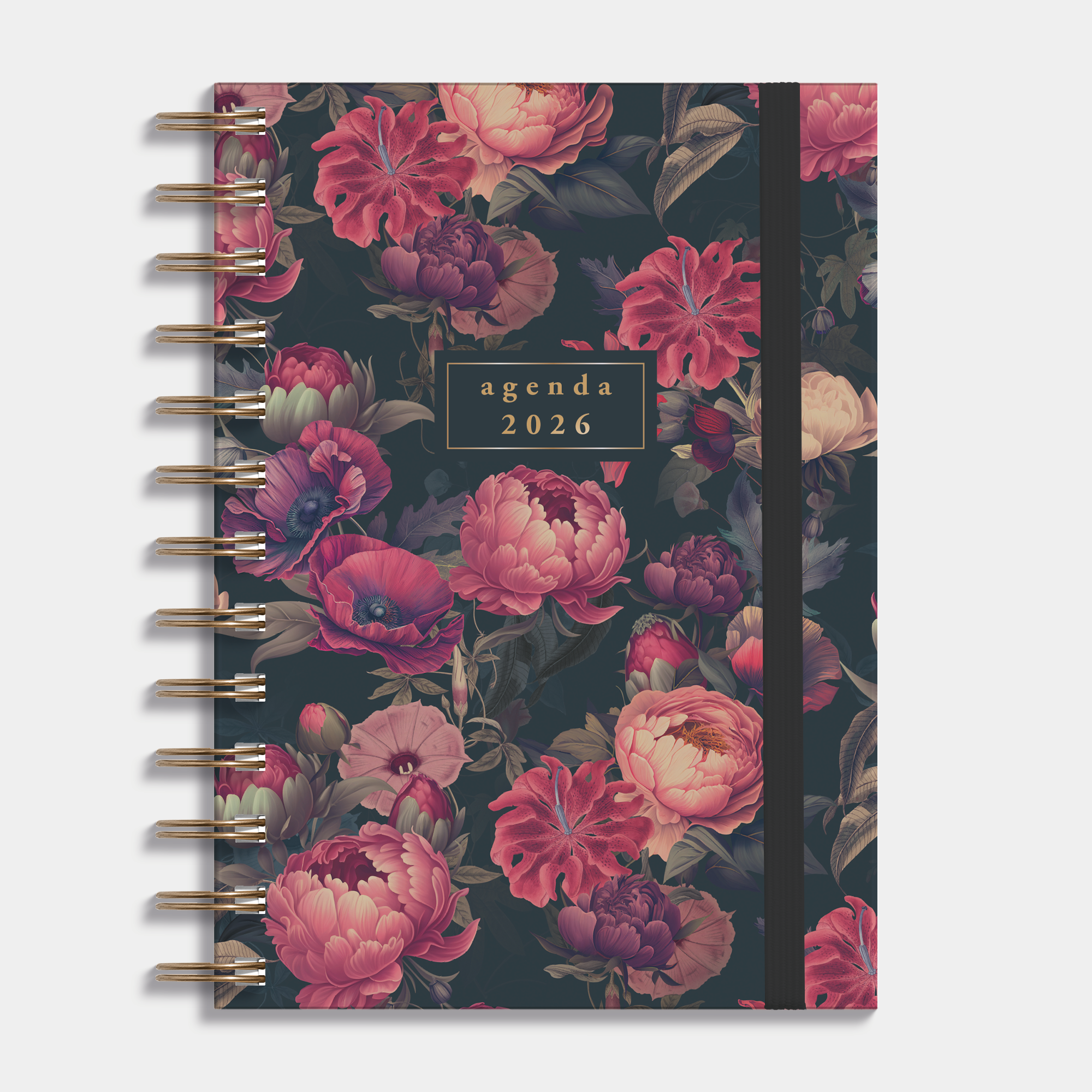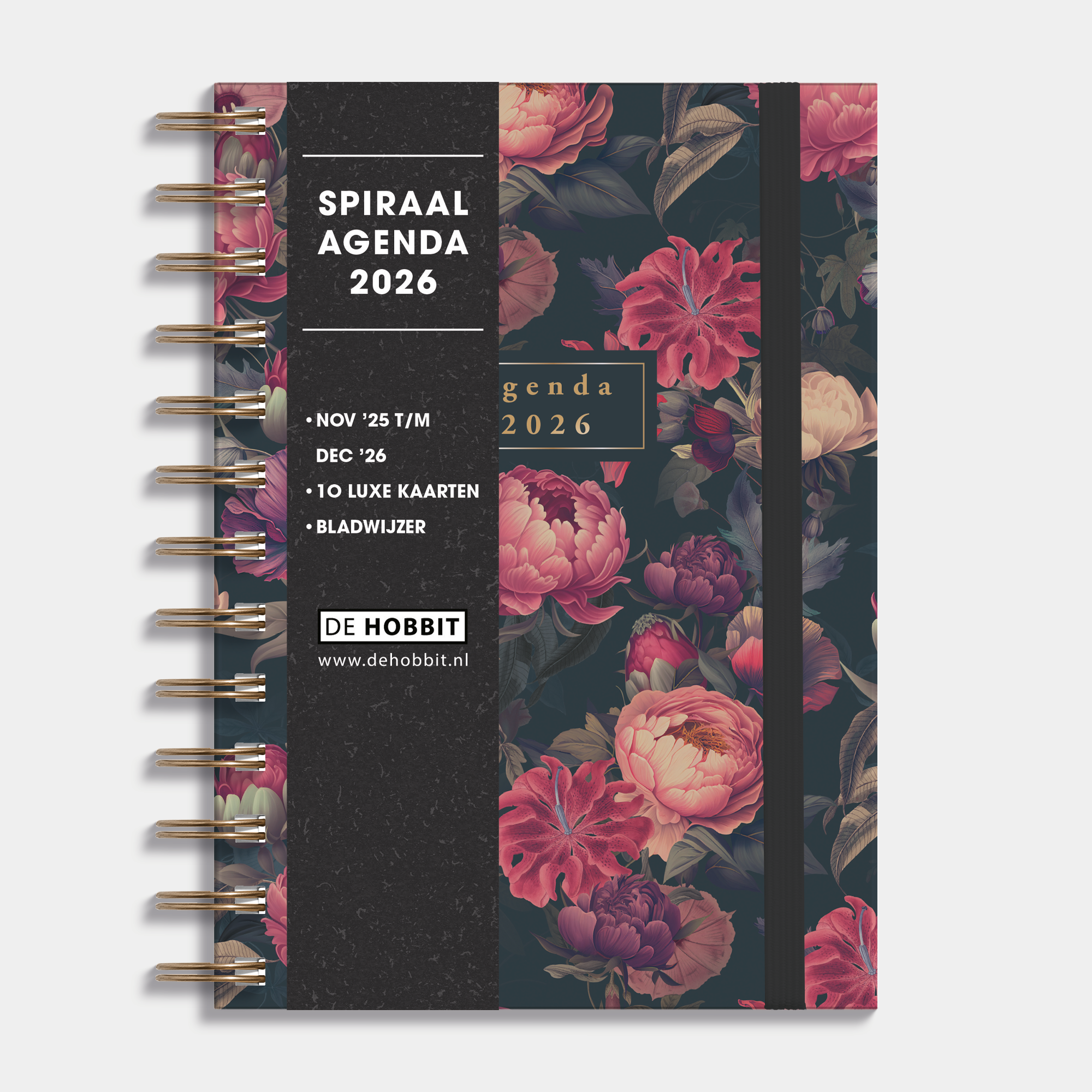 Stylish ring binder diary with hard cover. The cover has a print with beautiful flowers and birds in dark colors, the text on the cover is printed in gold foil. The diary is held closed by an elastic band and has a movable bookmark to quickly get to the correct date. The format of the calendar is éé one week over two pages and has 5 transparent inserts with ten beautiful cards. This diary runs from November 2025 to December 2026.