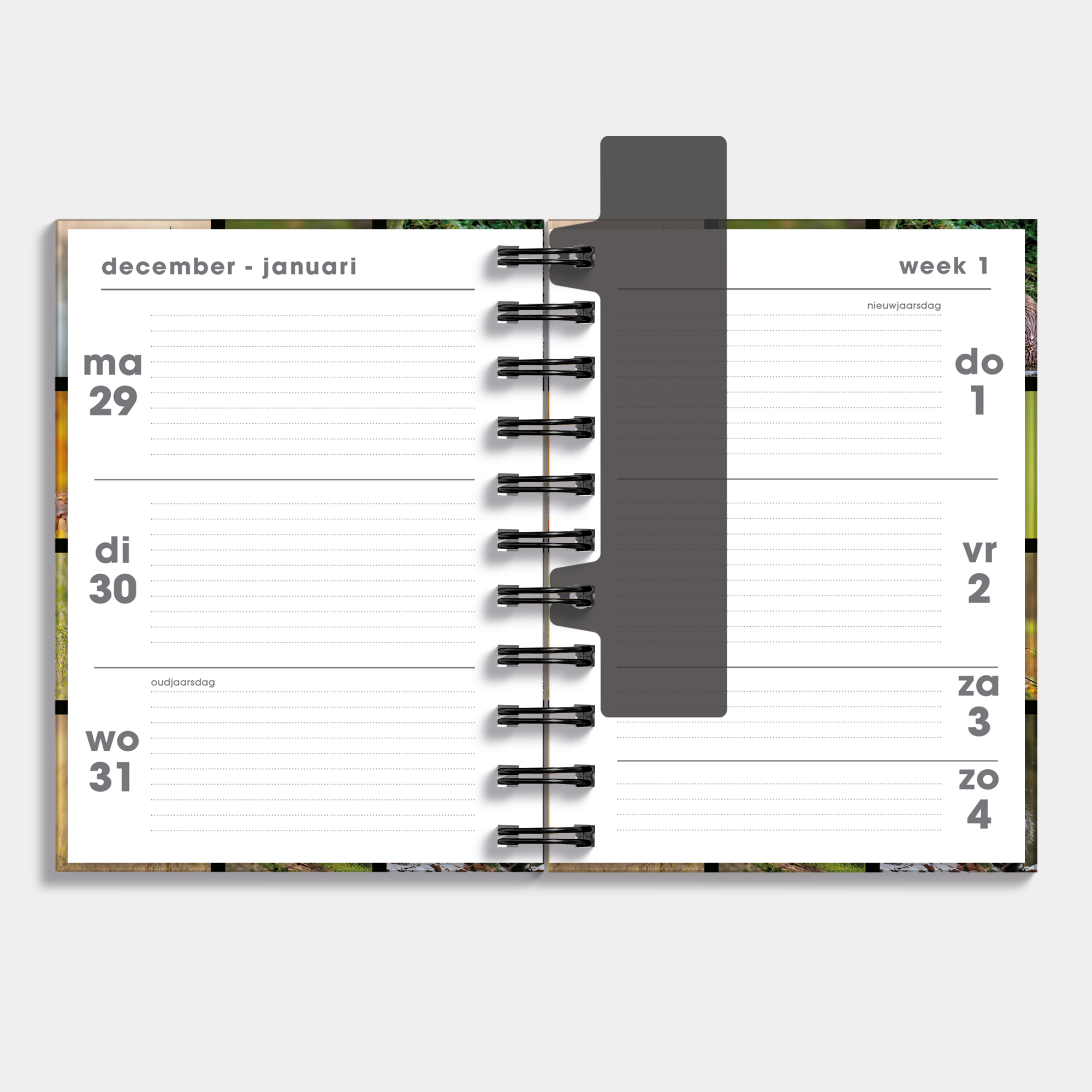 Spiral diary with hard cover featuring photos of wildlife in the Netherlands. The diary is held closed by an elastic band and has a movable bookmark to quickly get to the correct date. The format of the diary is one week over two pages and has 5 transparent inserts with ten beautiful gift cards with animals found in the wild in the Netherlands. This diary runs from November 2025 to December 2026.