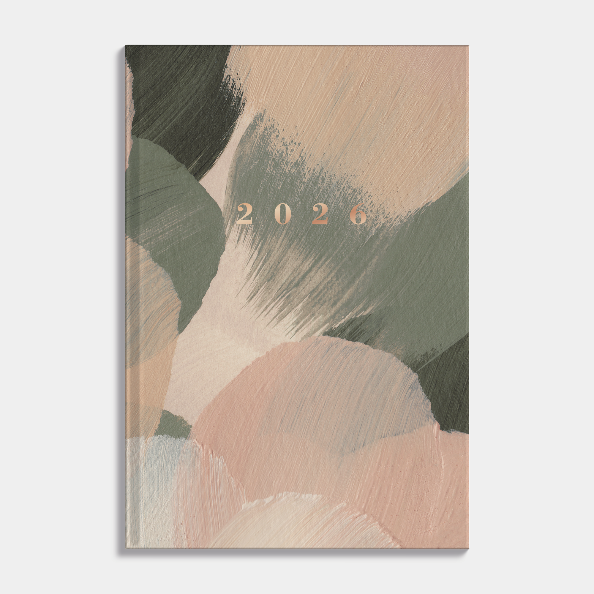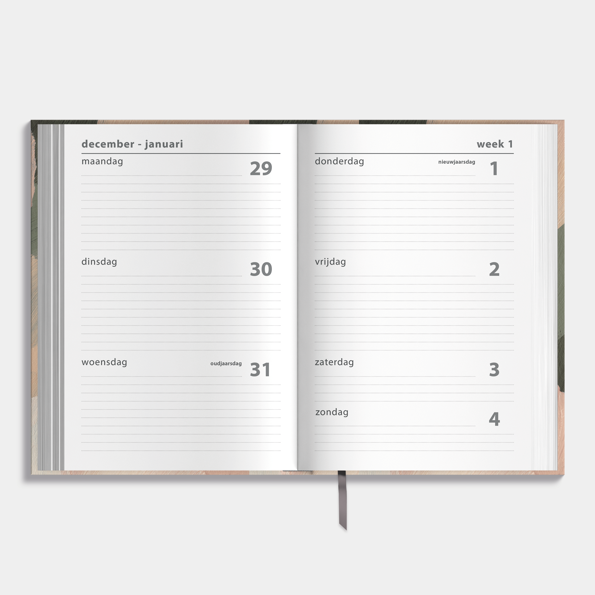 The basic diary with a hard cover, provided with a paint texture in neutral gray-green tones. The diary is quiet in design and features a reading ribbon. The diary layout is éé one week over two pages. This diary runs from November 2025 to December 2026.