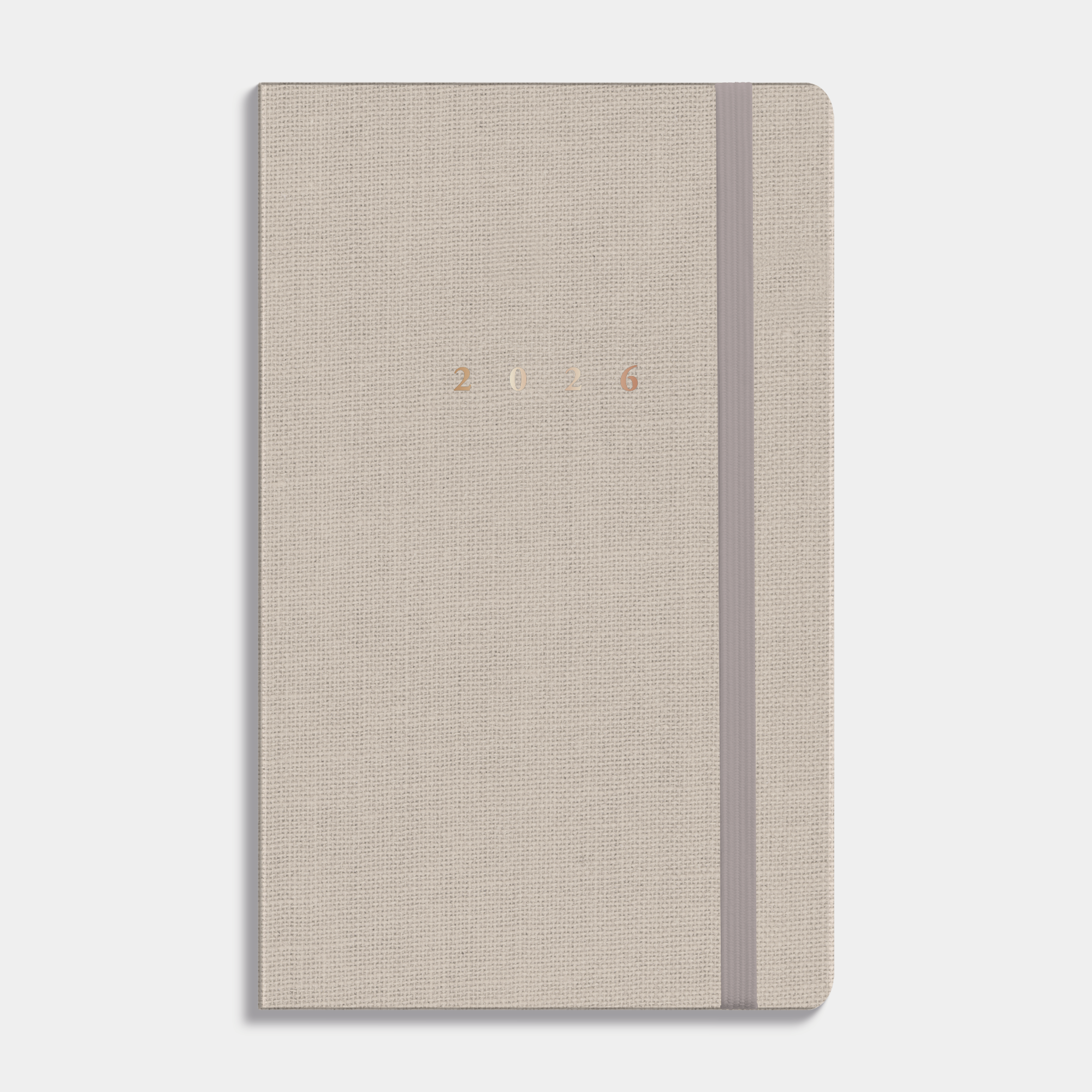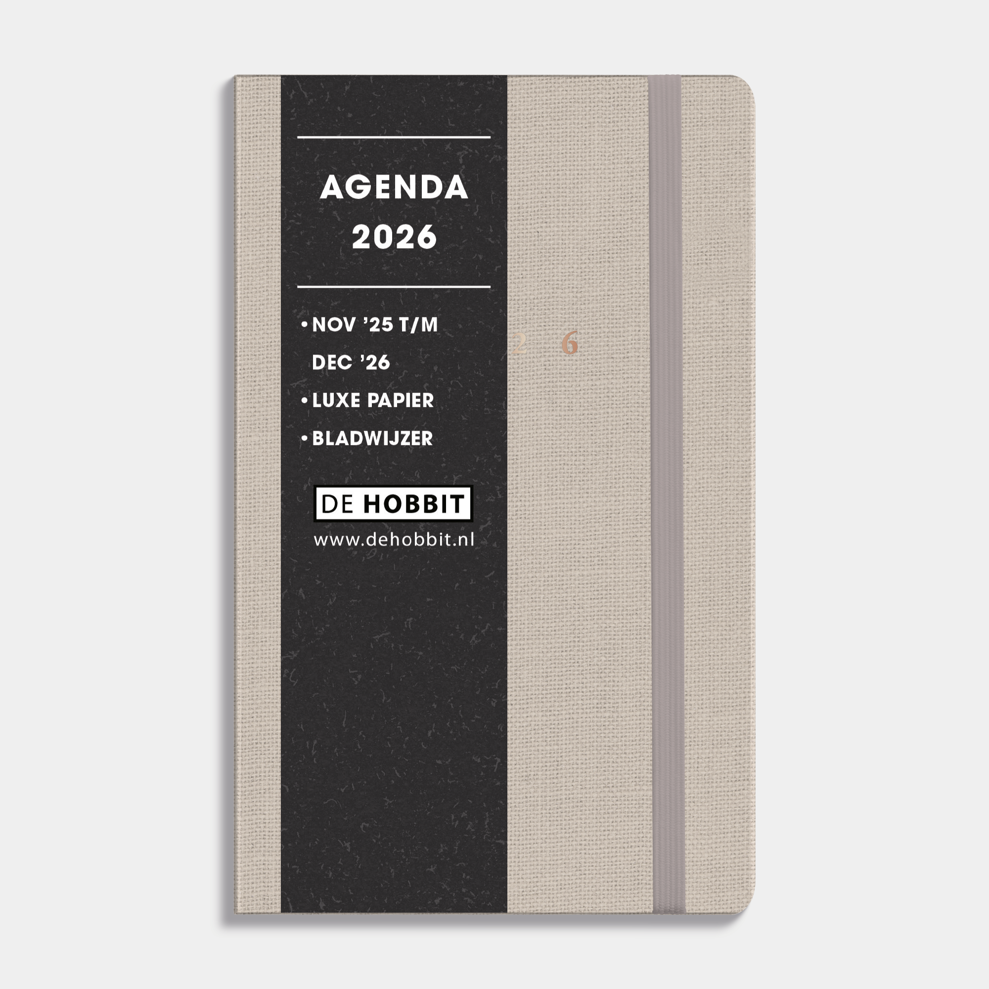 Compact deluxe diary with rounded corners. The cover is made of cool black washed craft paper. anthracite of su√®de look with a silver foil print. This luxury diary has a handy elastic band to keep the diary closed. Of course, a reading ribbon is not missing either. The calendar's format is √©√© one week over two pages'Äôs¬† and runs from November 2025 to December 2026.