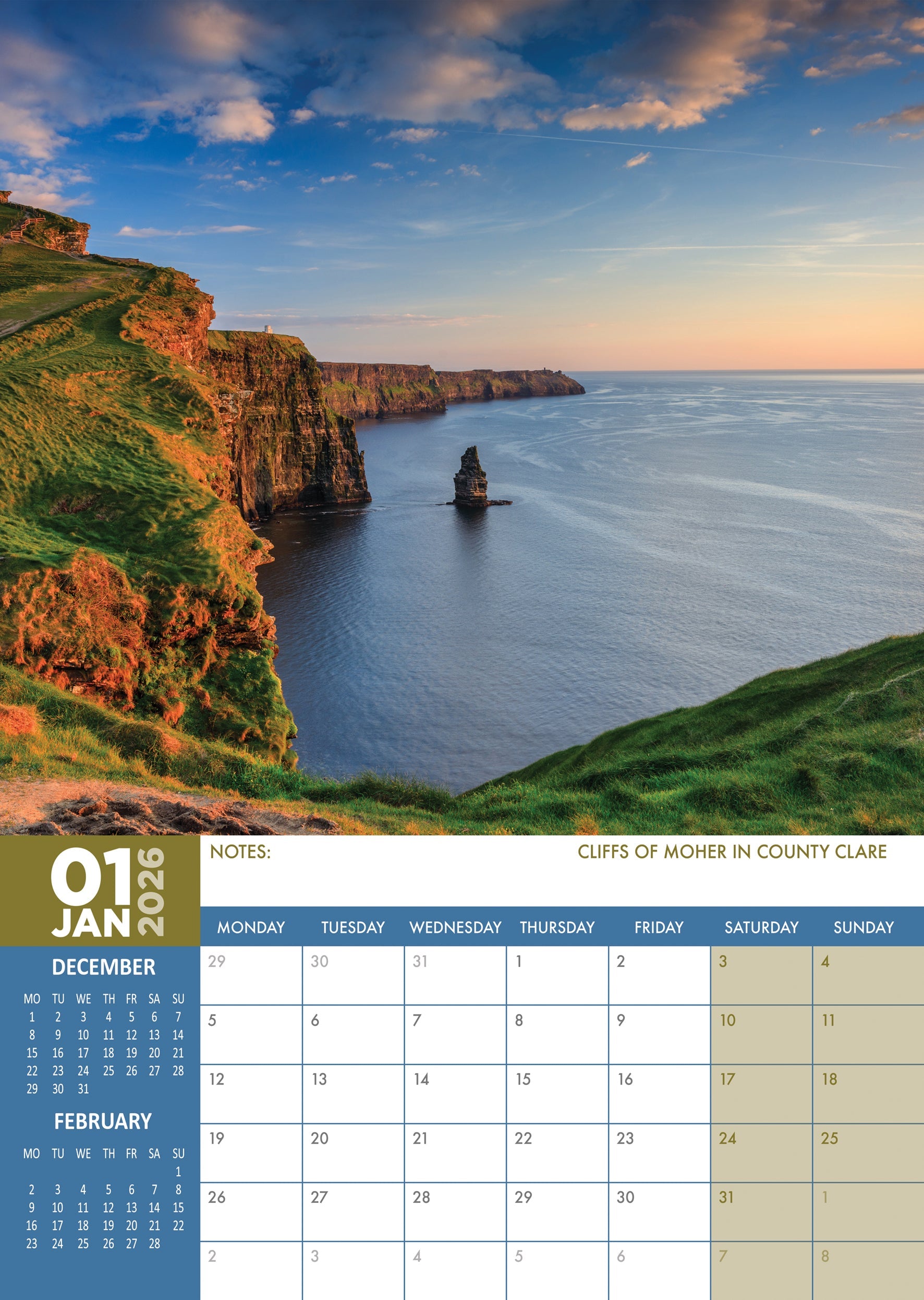 Experience the magical landscape of the Emerald Isle with the Ireland A3 Calendar 2026. In other words: each month takes you to a different beautiful part of Ireland - from dramatic coastlines like the Cliffs of Moher to misty valleys, ancient abbeys and colorful village streets. Perfect for nature lovers, walkers, photographers and fans of Celtic culture.