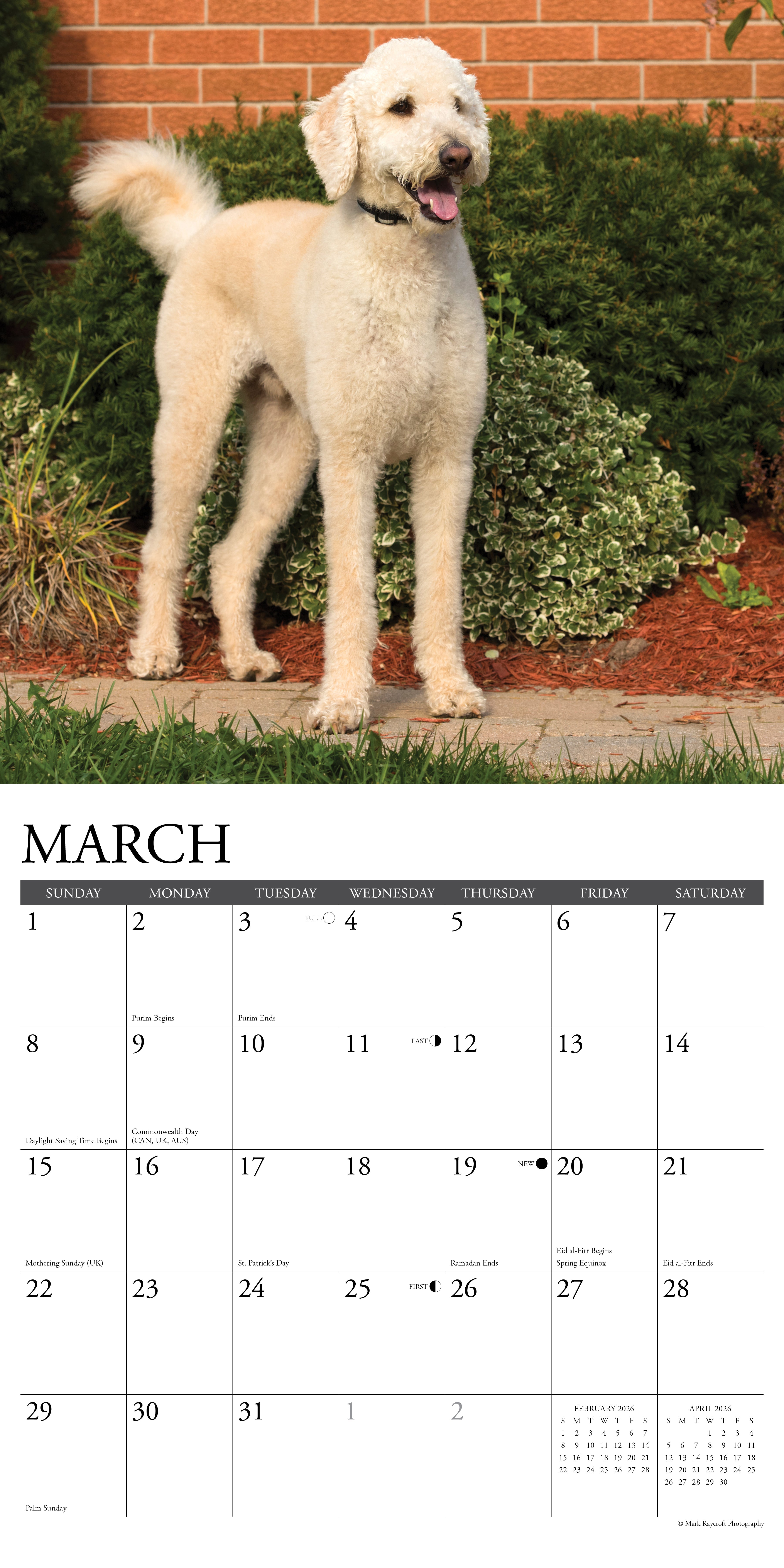 Labradoodle monthly calendar 2026 with beautiful photos. A year of beautiful Labradoodle photos every month with plenty of room for all your appointments. Easy to hang through the hole which is already pre-perforated. Read more