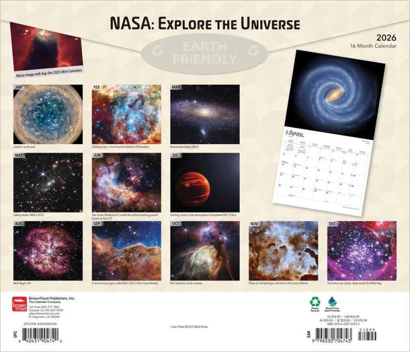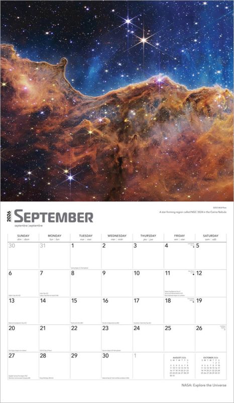 The NASA Explore the Universe Deluxe Calendar 2026 from publisher Browntrout starts in September 2025 and from January 2026 through December 2026 has a large picture with the dates of the month below.