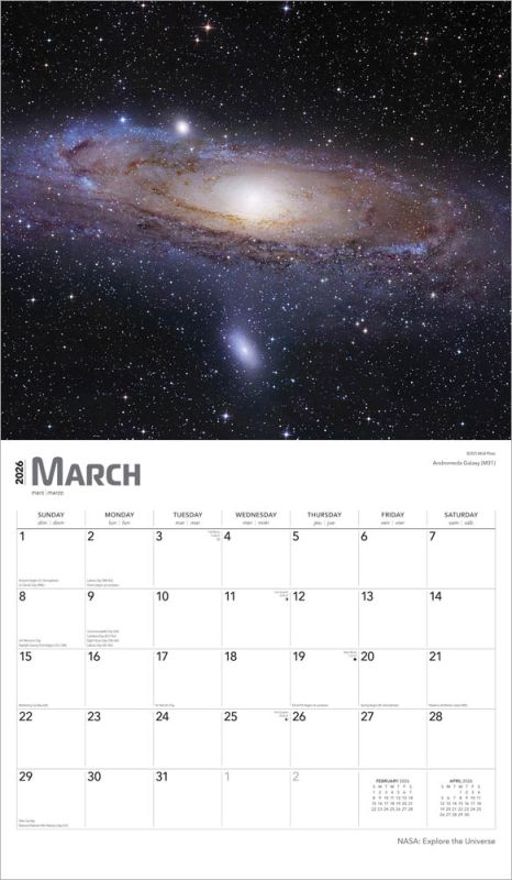 The calendar has a total of 13 different full-color images of 35 x 30 cm (1 full-color image with the last 3 months of 2025), then each month a different full-color image of the NASA Explore the Universe. Each calendar month has space for your personal notes.