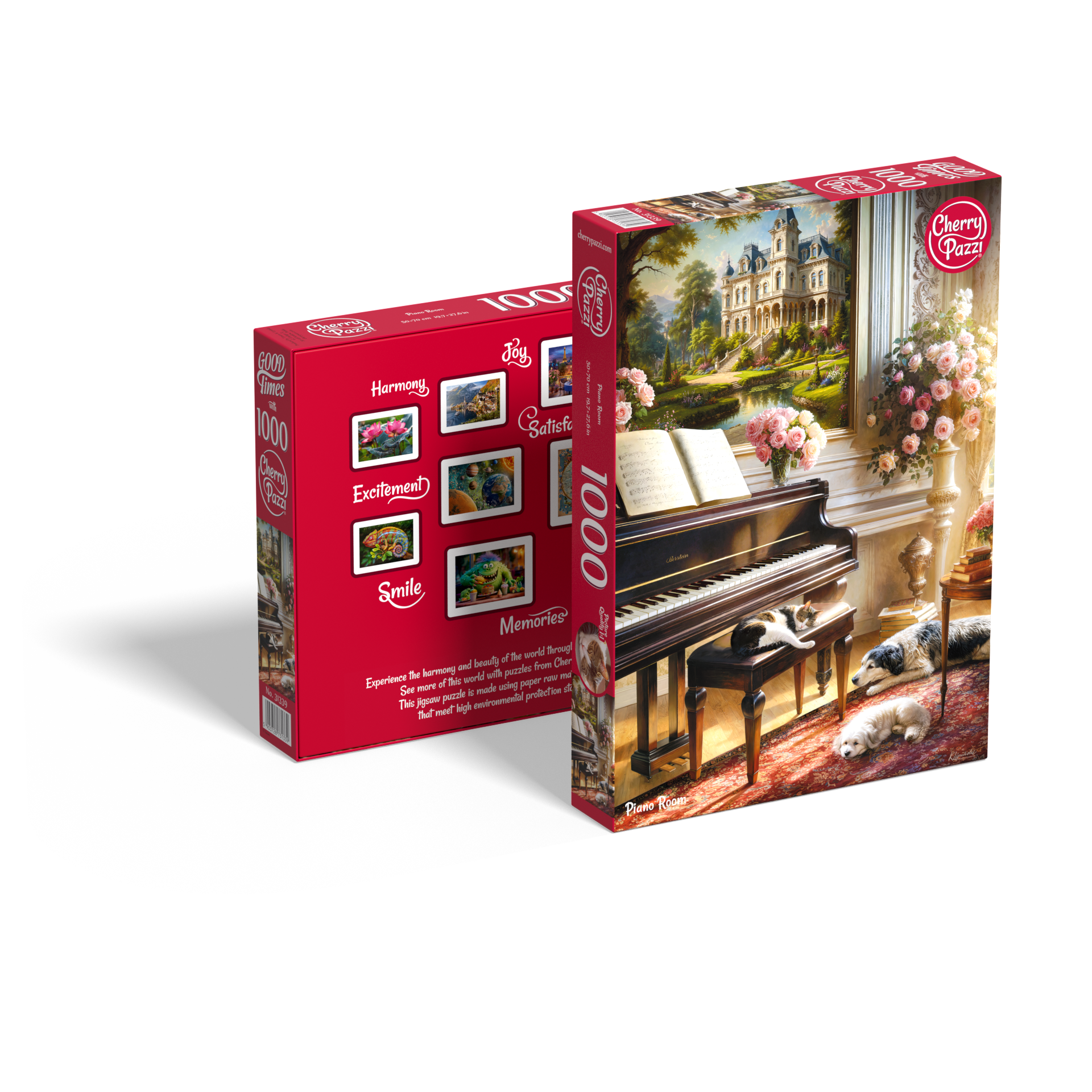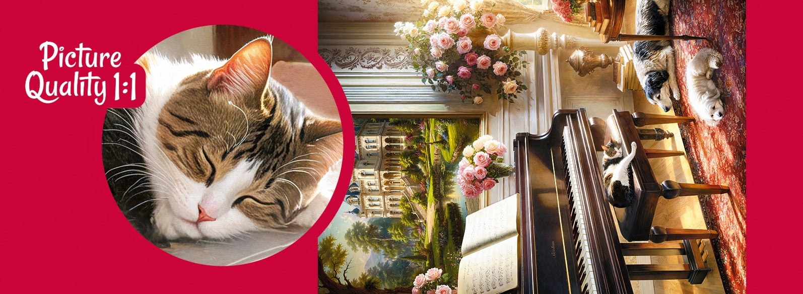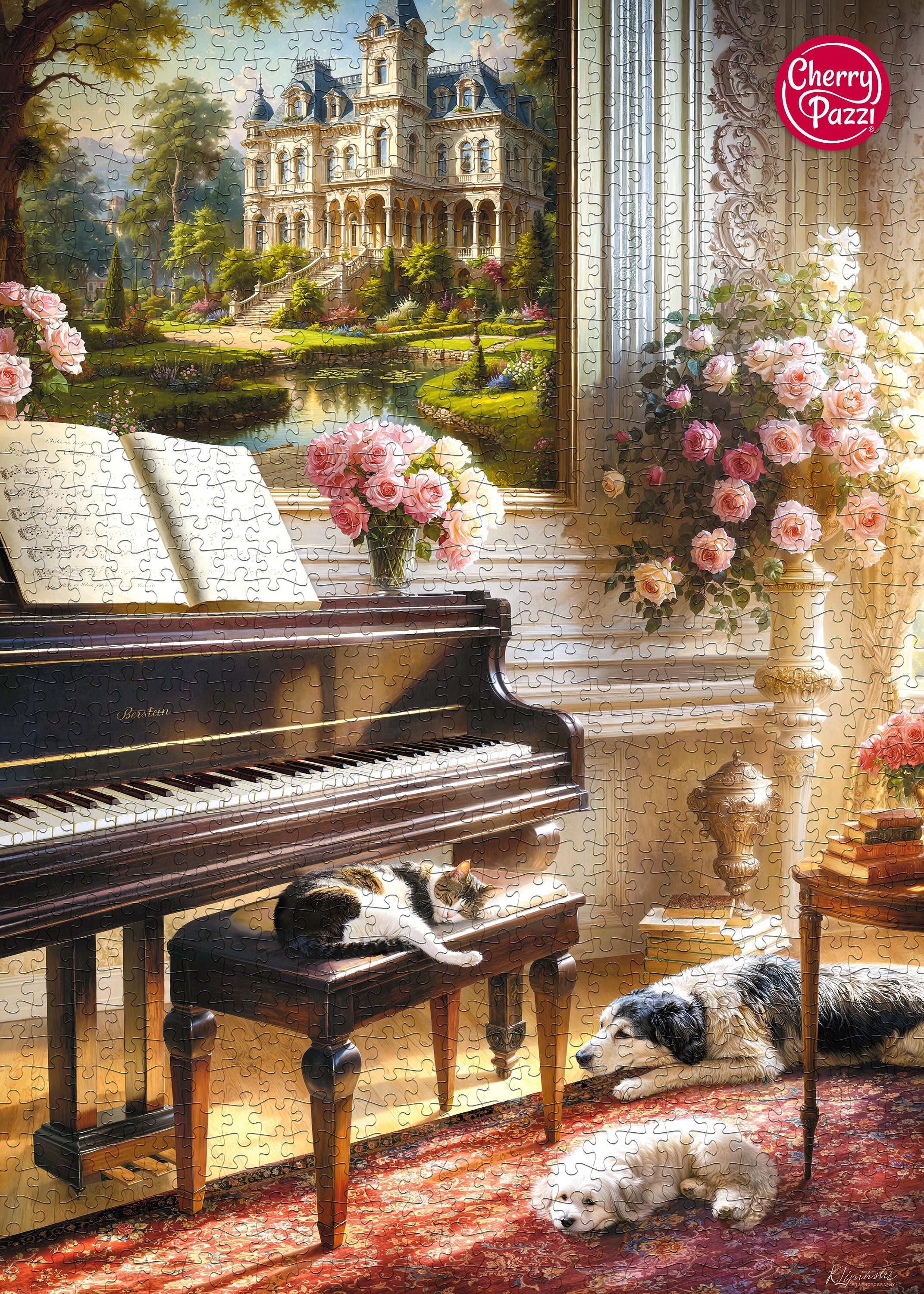 Ontdek de serene schoonheid van de Piano Room Puzzel 1000 Stukjes – een betoverend tafereel vol rust, elegantie en harmonie. Geniet van een prachtig moment van verfijning: een glanzende piano baadt in zacht licht, omringd door rozen, terwijl trouwe huisdieren ontspannen rusten. Op de achtergrond siert een statige villa het geheel en creëert zo een tijdloze sfeer van luxe en comfort. Beleef pure ontspanning en breng een vleugje klassieke elegantie in huis.